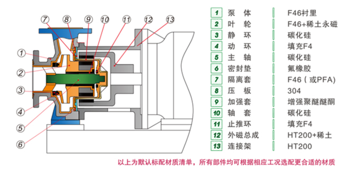 ZQC型氟塑料磁力泵是我公司原CQB-F磁力泵的升級版產(chǎn)品,該泵應用現(xiàn)代磁力學原理,利用永磁體實現(xiàn)無接觸間接傳動的一種化工流程泵。當電機帶動外轉(zhuǎn)子(即外磁鋼 )總成旋轉(zhuǎn)時,通過磁場的作用磁力線穿過隔離套帶動內(nèi)轉(zhuǎn)子(即內(nèi)磁鋼)總成和葉輪同步旋轉(zhuǎn),介質(zhì)完全封閉在靜止的隔離套內(nèi),從而達到無泄漏抽送介質(zhì)的目的,解決了機械傳動泵的軸封泄漏,是全密封、無泄漏、無污染、高效節(jié)能的新型工業(yè)泵。該系列磁力泵是化工流程中杜絕跑、冒、滴、漏現(xiàn)象,消除環(huán)境污染,創(chuàng)造“無泄漏車間”、“無泄漏工廠”實現(xiàn)安全、文明生產(chǎn)的理想用泵。