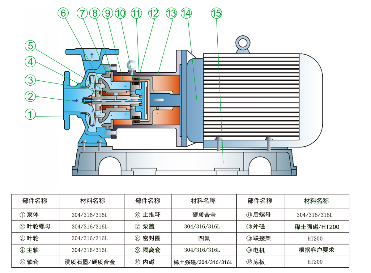 ZOBC大功率磁力泵過流部件采用全不銹鋼材料(304、316、316L),對有機酸,有機化合物,堿,中性溶液和各種氣體都有良好的耐蝕性,雙螺旋糟碳石墨軸承和硬質(zhì)合金軸套,具有較強的耐磨性,保證了產(chǎn)品的壽命,是無泄漏輸送腐蝕性介質(zhì)的理想用泵。